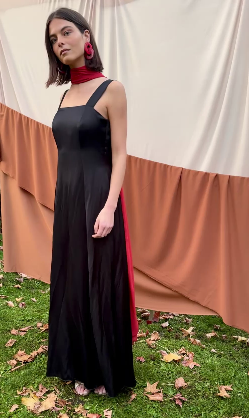 Descripción y composición: vestido de símil de seda poliéster con forro de la misma tela. Pinzas hasta la cadera que asientan la figura.